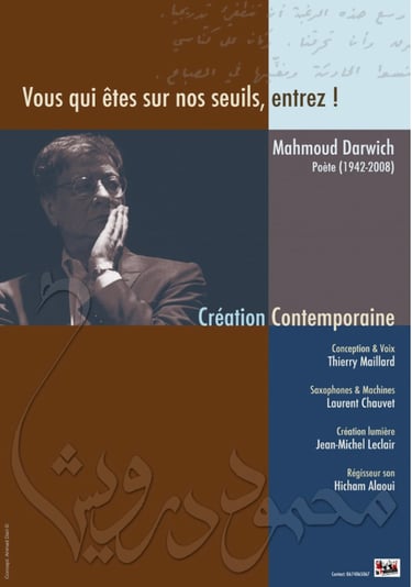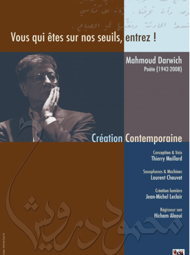 Ce concert spectacle est notre vision de l’œuvre poétique à portée universelle de Mahmoud Darwich. Une vision occidentale et résolument contemporaine. Une vision subjective héritière de plusieurs esthétiques : le happening pop’art ; la performance musicale et théâtrale ; la lumière rock et psychédélique ; le dadaïsme ; le vertige électronique ; l’improvisation…Une inspiration de grandes personnalités artistiques telles que Philippe Caubère, Michel Bouquet, Claude Nougaro, Mauricio Kagel, Pete Townshend, Jean Dubuffet, Franck Castorf…
